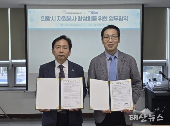 태산뉴스 이동욱 기자 | (사)의왕시종합자원봉사센터는 현대로템(주)과 9월 23일 센터 교육장에서 자원봉사 활성화를 위한 업무협약(MOU)을 체결했다.