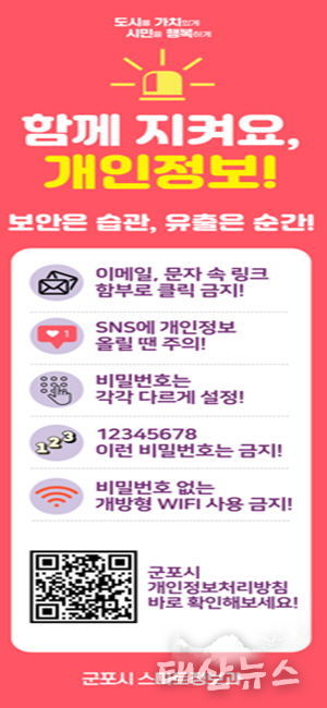 태산뉴스 이동욱 기자 | 군포시는 9월 30일 ‘개인정보 보호의 날’을 맞아 시민들의 개인정보 보호 인식을 높이고 생활 속 보호 문화를 확산하기 위해 ‘2025년 개인정보 보호의 날 기념 캠페인’을 9월 24일부터 10월 2일까지 추진한다.