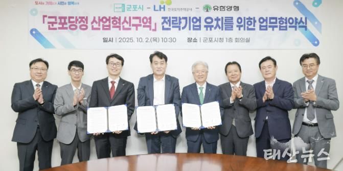 태산뉴스 이동욱 기자 | 군포시는 2일 군포시청에서 한국토지주택공사(LH), ㈜유한양행과 ‘군포당정 산업혁신구역’ R·D 전략기업 유치를 위한 업무협약을 체결했다고 밝혔다.