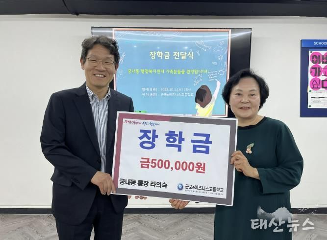 태산뉴스 이동욱 기자 | 라의숙 군포시 궁내동통장협의회장은 10월 1일 군포e비즈니스고등학교에 장학금을 전달하며 지역 청소년들의 꿈을 응원하는 뜻깊은 나눔을 실천했다.