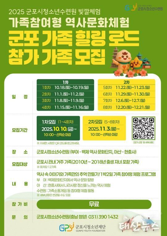태산뉴스 이동욱 기자 | 군포시청소년재단이 운영하는 군포시청소년수련원(충남 청양)은 관내 가족을 대상으로 2025년 가족참여형 역사문화탐방 '군포가족 힐링로드' 참가자를 모집한다.