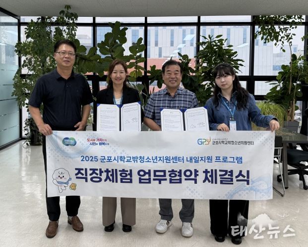 태산뉴스 이동욱 기자 | 군포시청소년재단(대표이사 김덕희), 군포시학교밖청소년지원센터(센터장 강연미)는 시각디자인 분야로의 진학과 진로를 희망하는 학교 밖 청소년을 지원하기 위해 관내 디자인 전문업체인 ㈜은진과 직장체험 업무협약을 체결했다고 밝혔다.