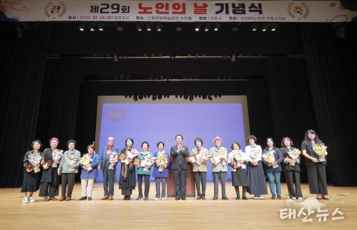 태산뉴스 이동욱 기자 | 군포시는 10월 14일 (사)대한노인회 군포시지회 주관으로 군포문화예술회관 수리홀에서 ‘제29회 노인의 날’ 기념식을 개최했다.