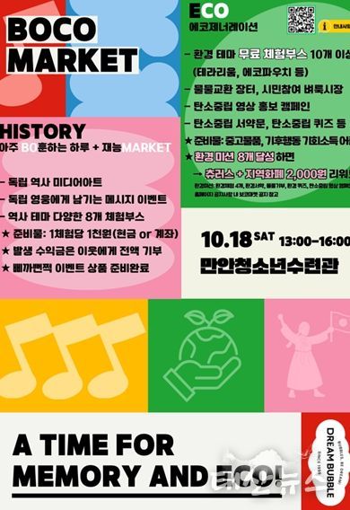 태산뉴스 이동욱 기자 | 안양시청소년재단 소속 만안청소년수련관은 오는 10월 18일 청소년과 시민이 함께하는 ‘환경과 역사를 잇다 - BOCO MARKET & E-G 페스티벌’을 개최한다고 15일 밝혔다.