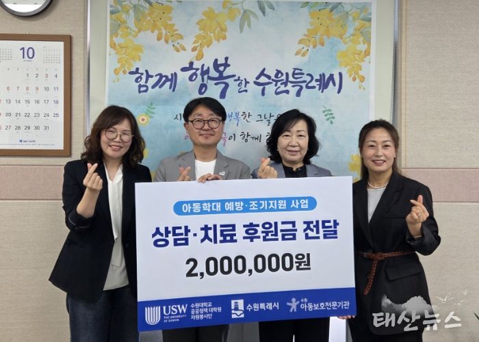 태산뉴스 이동욱 기자 | 수원대학교 공공정책대학원 자원봉사단이 “아동학대 예방과 조기지원 사업 대상자 지원을 위해 사용해달라”며 수원시에 200만 원을 기부했다.