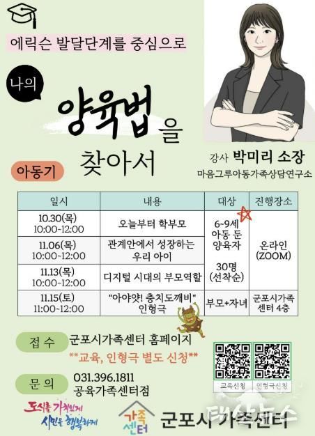 태산뉴스 이동욱 기자 | 군포시가족센터는 영유아기 및 아동기 자녀를 둔 양육자를 대상으로 ‘에릭슨의 심리사회적 발달단계’를 중심으로 한 온라인 ‘부모교육’을 각 3회에 걸쳐 총 6회 운영한다.