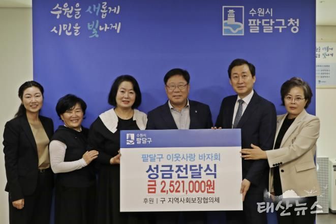 태산뉴스 이동욱 기자 | 수원시 팔달구와 구 지역사회보장협의체는 지난 15일 구청장실에서 ‘팔달구 이웃사랑 바자회’ 성금 전달식을 가졌다.