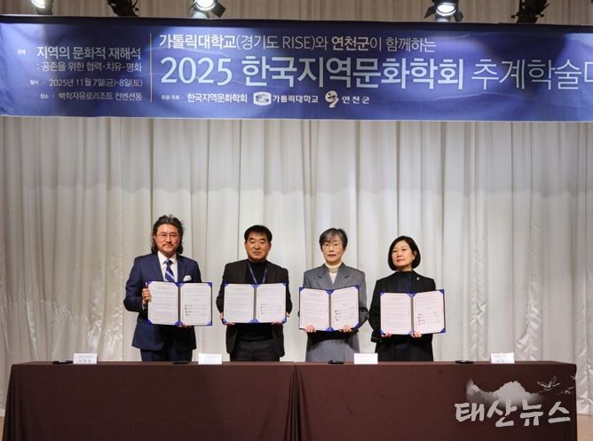 태산뉴스 김준수 기자 | 경기문화재단 전곡선사박물관은 지난 7일 백학자유로리조트 컨벤션센터에서 연천군, 가톨릭대학교, 한국지역문화학회와 경기도 RISE 사업과 연계한 ’경기북부 지역혁신 네트워크 구축‘ 업무협약(MOU)을 체결했다.