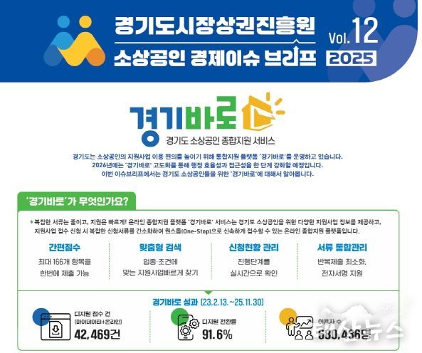 태산뉴스 김준수 기자 | 경기도시장상권진흥원은 22일, 도내 소상공인의 행정 편의와 정보 접근성을 높이기 위해 운영 중인 경기도 소상공인 종합지원 서비스 ‘경기바로’의 현황과 향후 개선 방향을 담은 「경기도 소상공인 경제 이슈 브리프 VOL.12」을 발간했다고 밝혔다.