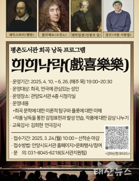 태산뉴스 이동욱 기자 | 안양시 동안구도서관은 오는 4월 10일부터 시민들에게 문학을 통한 건강한 소통의 시간을 마련하고 문학적 감수성을 높일 수 있는 희곡 낭독 프로그램 ‘희희낙락’을 운영한다고 20일 밝혔다.