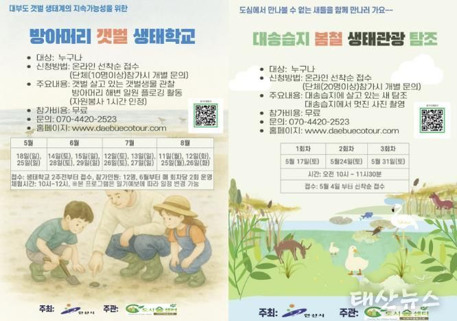 태산뉴스 이동욱 기자 | 안산시는 천혜의 자연경관을 가진 대부도를 체험할 수 있는 ‘방아머리해변 갯벌생태학교’와 ‘대송습지 철새탐조 프로그램’ 참여자를 선착순으로 모집한다고 14일 밝혔다.