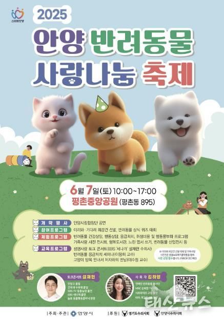 태산뉴스 이동욱 기자 | 안양시는 반려동물과 시민이 함께 어우러지는 따뜻한 소통의 장 ‘2025 안양 반려동물 사랑나눔 축제’를 오는 6월 7일 오전 10시부터 오후 5시까지 평촌중앙공원에서 개최한다고 22일 밝혔다.