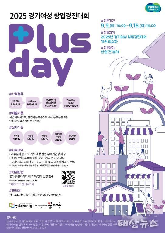태산뉴스 김준수 기자 | 경기도와 경기도일자리재단은 9월 9일부터 16일까지 2025년 여성창업경진대회 후속 행사인 ‘Plus Day(플러스 데이)’ 참가자를 모집한다. 이번 행사는 지난 5월 본 대회에서 17대 1의 높은 경쟁률로 아쉽게 탈락한 여성 창업자를 대상으로 마련됐다.
