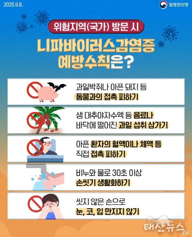 태산뉴스 김준수 기자 | 오산시는 질병관리청이 지난 9월 8일 니파바이러스감염증을 제1급감염병으로 신규 지정함에 따라 시민들에게 감염예방수칙 준수와 개인위생 관리에 철저를 기해줄 것을 당부했다.