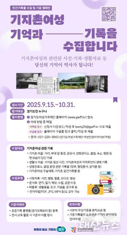 태산뉴스 김준수 기자 | 경기도와 경기도여성가족재단은 ‘기지촌여성 인권 기록 아카이브 구축사업’의 하나로, ‘기지촌여성 민간기록물 수집 및 기증 캠페인’을 9월 15일부터 10월 31일까지 추진한다.