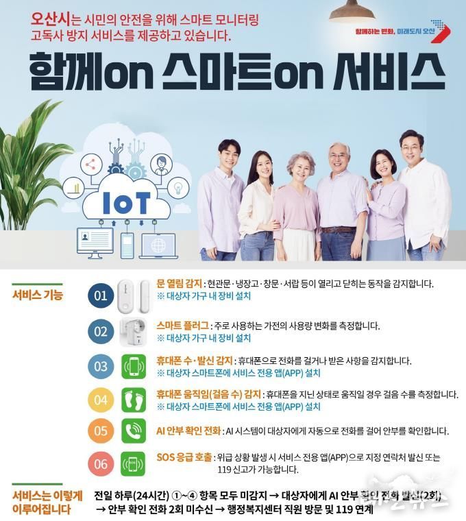 태산뉴스 이동욱 기자 | 오산시는 9월부터 관내 고독사 위험 시민들의 사회적 고립을 해소하고 고독사 예방을 위해 사물인터넷(IoT) 기반 디지털 모니터링 서비스인 ‘함께on 스마트on 서비스’를 운영한다고 밝혔다.