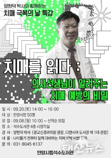 태산뉴스 이동욱 기자 | 안양시 석수도서관은 9월 21일 ‘치매극복의 날’을 기념하여 오는 20일 오후 2시 ‘치매를 읽다 : 의사 선생님이 알려주는 치매 예방의 비밀’ 특강을 개최한다고 11일 밝혔다.