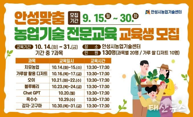 태산뉴스 이동욱 기자 | 안성시농업기술센터는 오는 9월 15일부터 30일까지 안성맞춤 농업기술 전문교육 교육생을 모집한다고 밝혔다.