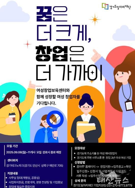 태산뉴스 김준수 기자 | 경기도일자리재단은 여성기업인 성장 지원 및 여성 창업 활성화를 위해 ‘2025년 경기도여성창업보육센터 신규 입주기업’을 상시 모집중에 있다.