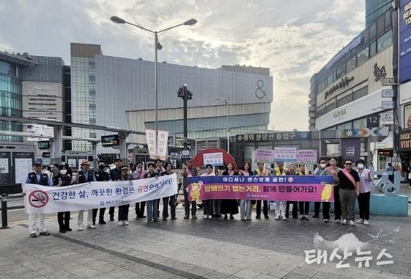 태산뉴스 이동욱 기자 | 수원시 팔달구 매산동은 지난 9월 15일 팔달구보건소 주관으로 진행된 ‘로데오거리 금연환경조성 합동 캠페인’에 수원팔달경찰서, 팔달구청, 매산로 테마거리 상인회 등과 함께 참여하여 금연문화 정착과 깨끗한 거리환경 조성을 위한 활동을 펼쳤다.