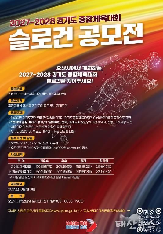 태산뉴스 이동욱 기자 | 오산시는 9월 17일부터 26일까지 ‘2027~2028년 경기도종합체육대회 슬로건 공모전’을 진행한다고 밝혔다.