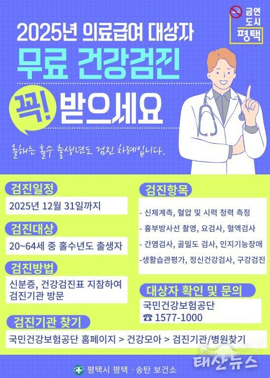태산뉴스 이지율 기자 | 평택시가 선선한 가을바람과 함께 올 한 해의 건강을 점검할 기회로, 의료급여 수급권자의 2025년 일반건강검진 참여를 장려한다.