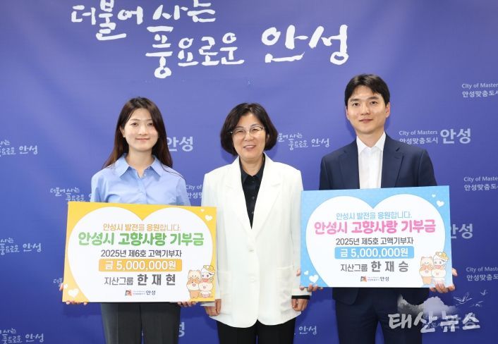 태산뉴스 이동욱 기자 | 안성시는 15일 본청 시장실에서 ‘안성시 고향사랑기부제 고액기부금 전달식’을 열고, 지산그룹의 한재승 이사와 한재현 변호사가 각각 500만 원씩 총 1천만 원을 고향사랑기부금으로 기탁했다고 밝혔다.