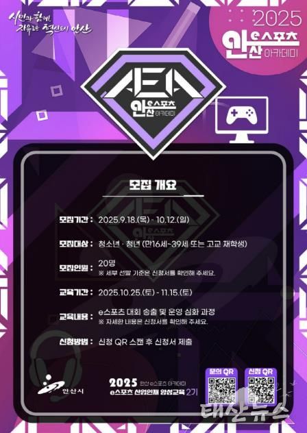 태산뉴스 이동욱 기자 | 안산시는 오는 18일부터 e스포츠 산업 진출을 꿈꾸는 청년들을 대상으로 ‘2025 안산 e스포츠 아카데미 산업인재 양성교육 2기’ 참가자를 모집한다고 17일 밝혔다.