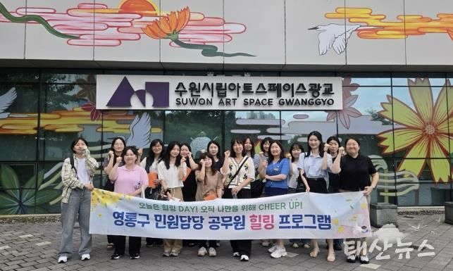 태산뉴스 이동욱 기자 | 수원시 영통구는 지난 16일, 수원시립아트스페이스광교에서 영통구 민원담당 공무원을 대상으로 -오늘은 힐링 DAY! 나를 위해 Cheer up!- 영통구 민원담당 공무원 마음치유를 위한 힐링 프로그램을 진행했다. 이번 프로그램은 반복적인 민원응대에 지친 공무원들이 일상에서 벗어나 몸과 마음의 여유를 되찾을 수 있도록 기획됐다.