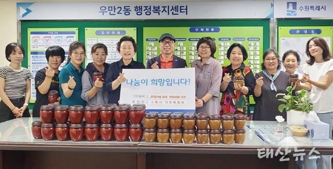 태산뉴스 이동욱 기자 | 지난 9월 16일, 수원시 다문화협회는 우만2동 행정복지센터에서 ‘전통장류 이웃돕기 전달식’을 진행하며, 고추장 30개(1kg)와 된장 30개(500g)를 수원시 팔달구 우만2동에 전달했다.