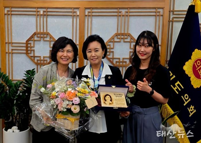 태산뉴스 김준수 기자 | 경기도의회 정윤경 부의장(더불어민주당, 군포1)은 9월 16일 도의회 부의장실에서 열린 경기도 학교사회복지사업 발전 방향 간담회에서 군포·의왕 학교사회복지사들로부터 감사패를 전달받았다.