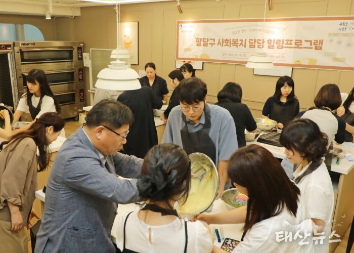태산뉴스 이동욱 기자 | 지난 18일 수원시 팔달구 사회복지업무 담당 공무원 17명이 참여한 가운데, 올해 세 번째 사회복지 담당 공무원 힐링프로그램인 ‘원데이 베이킹클래스’가 진행됐다.