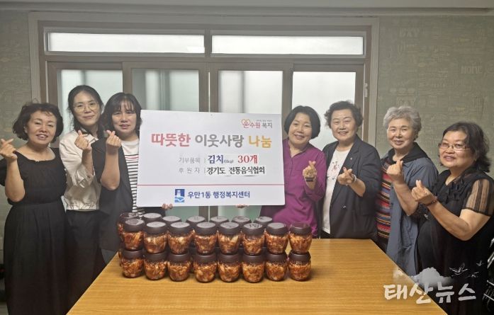 태산뉴스 이동욱 기자 | (사)경기도전통음식협회는 9월 18일 수원시 팔달구 우만1동에 정성껏 담근 김치(1kg) 30통을 기부했다.
