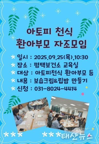 태산뉴스 이지율 기자 | 평택시는 지역 사회 중심의 알레르기 질환(아토피·천식 등) 예방관리 환경 조성을 위해 ‘아토피·천식 환아 부모 자조모임’을 운영하고 있으며, 오는 25일 열리는 3분기 모임에 함께할 신규 참여자를 모집한다.