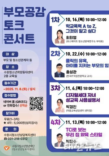 태산뉴스 이동욱 기자 | 수원시청소년청년재단 청소년상담복지센터는 청소년기 자녀 양육에 필요한 정보를 제공하고 부모의 역량을 강화하기 위해 ‘2025년 부모공감 토크콘서트’를 오는 10월 16일부터 11월 13일까지 총 4회에 걸쳐 운영한다.
