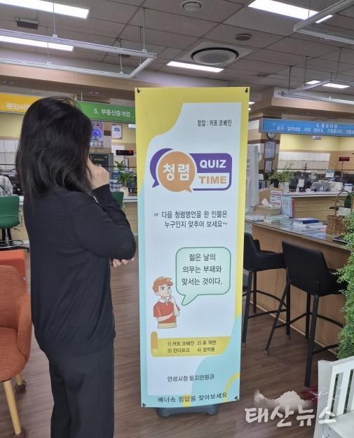 태산뉴스 이동욱 기자 | 안성시 토지민원과는 청렴한 공직문화 조성을 위한 다양한 노력을 기울이는 가운데 청렴시책의 일환으로 지난 17일 ‘민원인과 함께하는 청렴배너’를 제작하여 민원실에 설치했다.