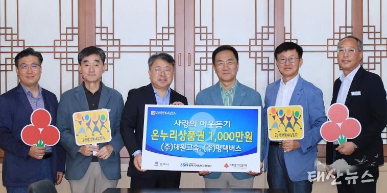 태산뉴스 이동욱 기자 | ㈜대원고속·㈜평택버스는 지난 17일 추석에 앞서 취약계층을 위해 평택행복나눔본부로 온누리상품권 1천만 원을 전달했다.