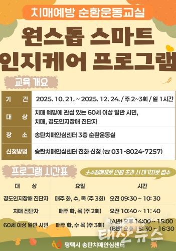 현재 4기 참여자에 대한 접수를 받고 있으며, 신청 대상은 치매 고위험군뿐 아니라 치매 예방에 관심 있는 만 60세 이상 주민 누구나 가능하다. 참여 희망자는 송탄치매안심센터로 문의하면 된다.
