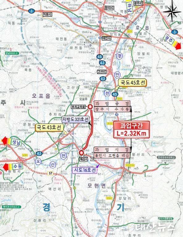 태산뉴스 김준수 기자 | 용인시 처인구 모현읍 매산리와 광주시 추자동을 연결하는 ‘지방도321호선 매산~일산간 도로 확포장공사’가 완료돼 25일 낮 12시부터 공식 개통한다.