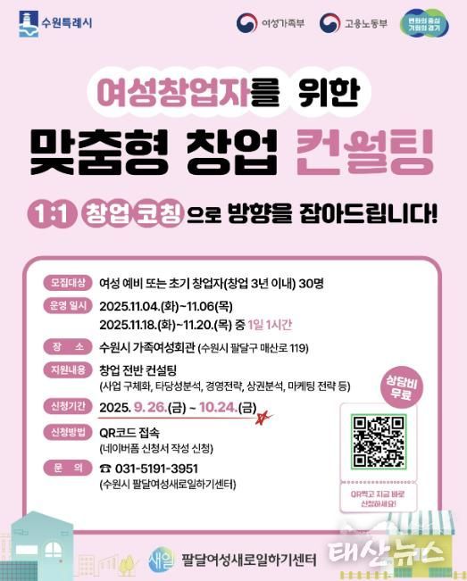 1대1 맞춤형 창업컨설팅은 11월 4~6일, 11월 18~20일 팔달여성새로일하기센터에서 진행된다. 전문 컨설턴트가 ▲창업 단계별 문제 진단 ▲사업 모델 구체화 ▲자금조달·정부지원사업 활용 ▲마케팅 전략 등 창업 전반에 대한 맞춤형 1대1 상담을 제공한다.
