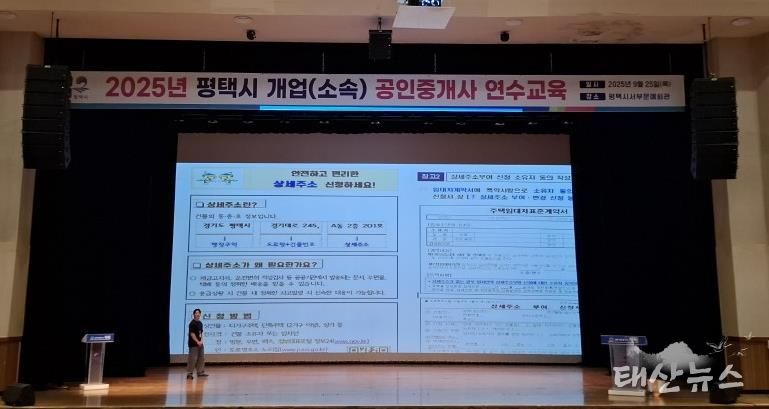 태산뉴스 이동욱 기자 | 평택시 토지정보과는 지난 25일 서부문화예술회관에서 실시한 ‘2025년 공인중개사 연수교육’ 현장에서 ‘상세주소제도’ 등 도로명주소 관련 홍보를 했다.