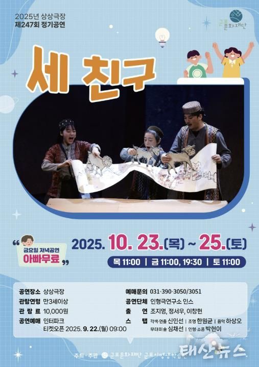 태산뉴스 이지율 기자 | 군포문화재단 군포시평생학습원 상상극장은 오는 10월 23일부터 25일까지 가족 모두가 즐길 수 있는 인형극‘세 친구’를 정기공연으로 무대에 올린다.