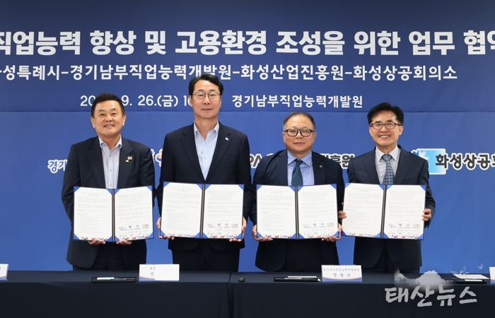태산뉴스 이지율 기자 | 화성특례시가 26일 경기남부직업능력개발원·화성상공회의소·화성산업진흥원과 ‘장애인의 직업능력 향상 및 장애친화형 고용 환경 조성을 위한 업무협약’을 체결했다.