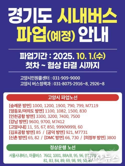 태산뉴스 이동욱 기자 | 고양특례시는 오는 10월 1일 예고된 경기도 시내버스 총파업에 대비해 시민 불편을 최소화하기 위한 비상수송대책을 수립하고, 대체 교통수단 확보에 나섰다고 29일 밝혔다.