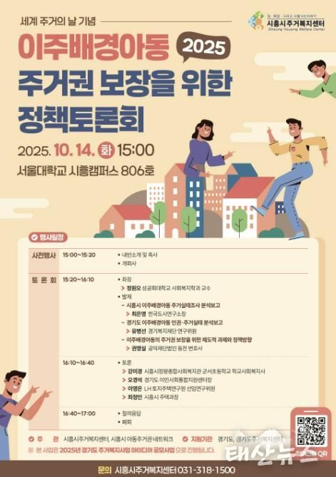 태산뉴스 이동욱 기자 | 시흥시주거복지센터는 오는 10월 14일 오후 3시, 서울대학교 시흥캠퍼스 806호에서 ‘이주배경아동 주거권 보장을 위한 정책토론회’를 개최한다.