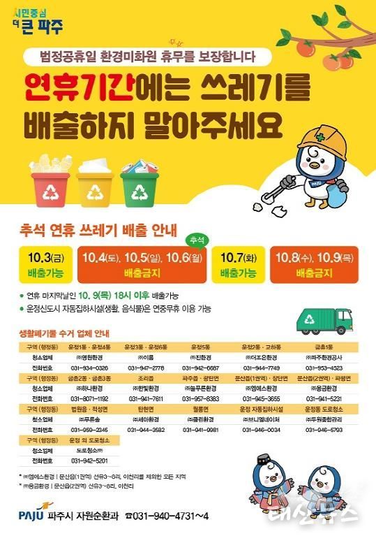태산뉴스 이동욱 기자 | 파주시는 환경미화원 휴무 보장을 위해 추석 연휴 기간인 10월 4일부터 10월 6일, 10월 8일부터 10월 9일까지는 생활폐기물을 배출해서는 안 되며, 이 기간 동안에는 생활쓰레기 수거가 중단된다고 밝혔다.