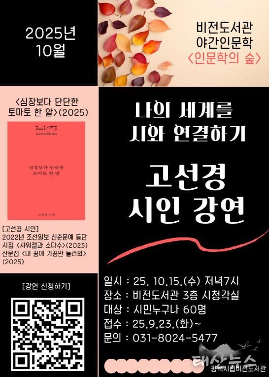 태산뉴스 이지율 기자 | 평택시 비전도서관은 오는 10월 15일 저녁 7시 '심장보다 단단한 토마토 한 알'의 고선경 시인을 초청하여 ‘나의 세계를 시와 연결하기’를 주제로 야간 인문학 강연을 진행한다.