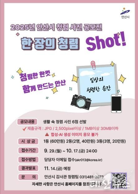 태산뉴스 이동욱 기자 | 안산시는 청렴문화 확산과 시민 공감대 형성을 위해 ‘2025 한 장의 청렴, Shot! 사진 공모전’을 개최한다고 30일 밝혔다.