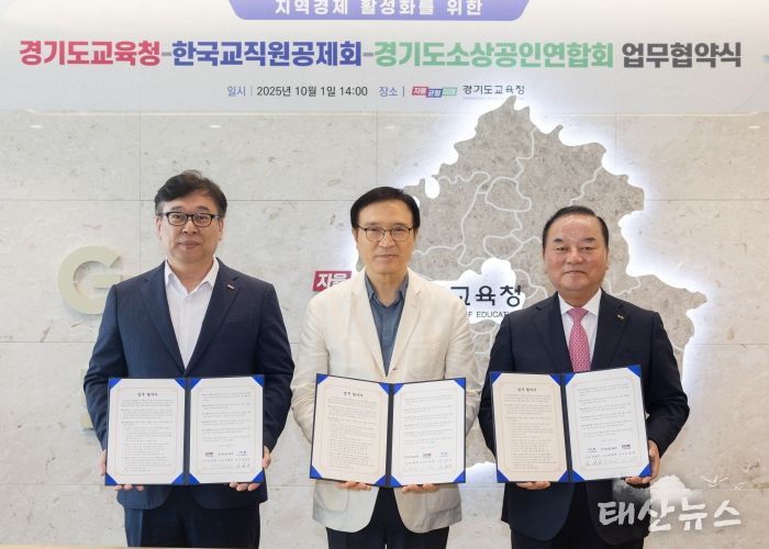 태산뉴스 김준수 기자 | 경기도교육청이 1일 남부청사에서 경기도소상공인연합회, 한국교직원공제회와 ‘지역경제 활성화를 위한 상생 업무협약’을 체결했다.