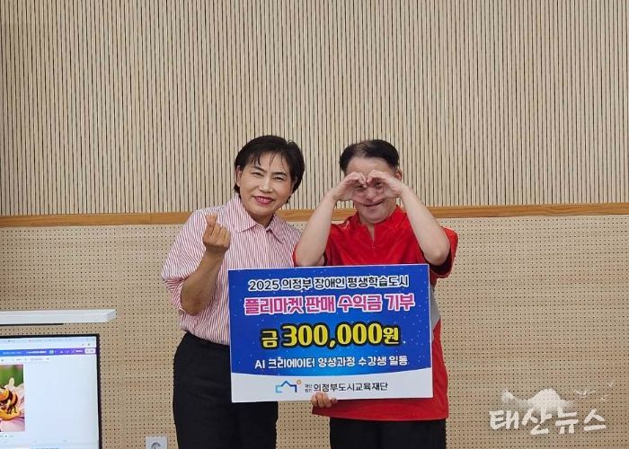 태산뉴스 이동욱 기자 | 의정부도시교육재단은 장애인평생학습도시 사업의 일환으로 운영된 'AI 크리에이터 양성과정' 장애인 수강생들이 직접 제작한 상품 판매 수익금을 지역사회에 기부했다고 30일 밝혔다.